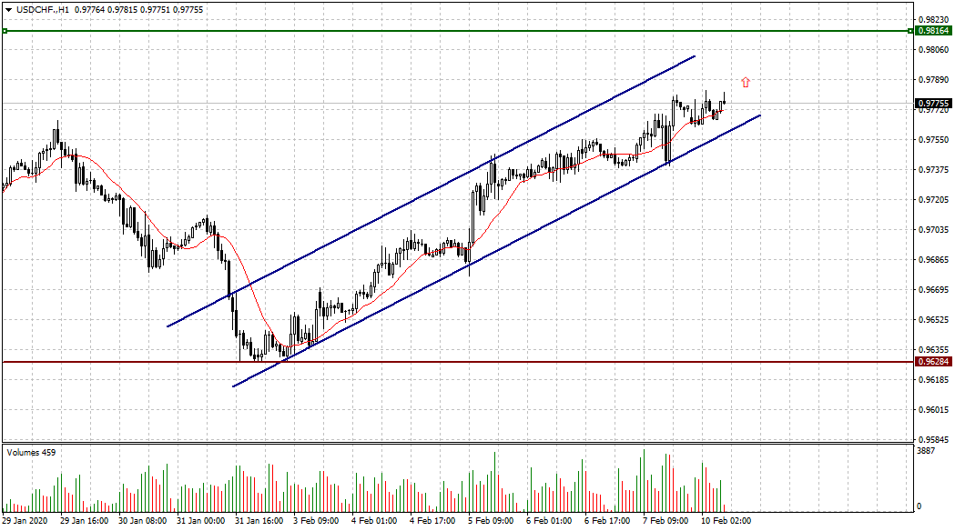 По состоянию на утро, 10 февраля, ценовая отметка по валютной паре USD/CHF торгуется в диапазоне 0,9776-0,9781. Так как валютная пара пребывает в равноудаленного восходящего канала, то рассматриваем открытие сделок на покупку. Вход в рынок после пробития уровня сопротивления 0,9816.