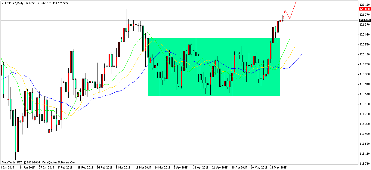 USD/JPY продолжает свой рост и уже вплотную подобрался к максимуму от 10 марта 2015 года. Уровню сопротивления 122,00. После выхода с продолжительной консолидации, которое мы могли наблюдать на прошлой неделе, я ожидаю импульсного пробития 122,00.