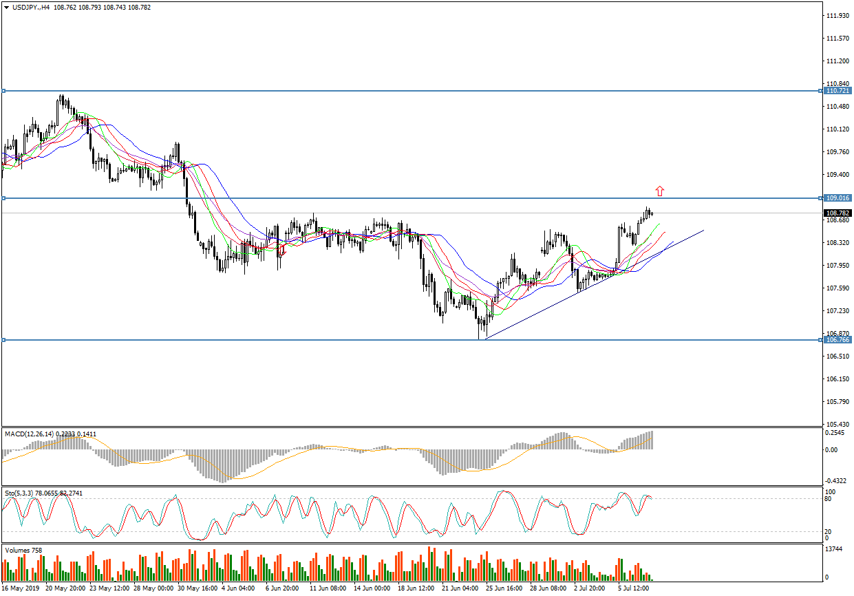 По состоянию на утро, 09 июля, ценовая отметка по валютной паре USD/JPY торгуется в диапазоне 108,71 - 108,86. Для входа в рынок рекомендуем дождаться пробития зоны сопротивления 109,01.