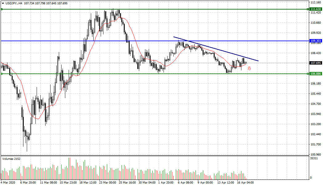 По состоянию на утро, 17 апреля, ценовая отметка по валютной паре USD/JPY торгуется в диапазоне 107,64 - 107,79. Так как валютная пара пребывает в низходящей тенденции в рамках бокового канала, то рассматриваем открытие сделок на продажу. Ожидаем пробитие сформировавшегося уровня поддержки. Пробитие цены вниз с последующей фиксацией под уровнем, будет сигналом к открытию сделок на sell.