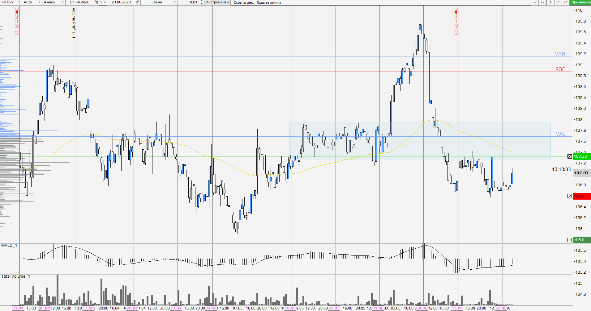 Валютная пара доллар-йена торгуется в нисходящем тренде и существует высокая вероятность его продолжения. Стоит отметить, что ключевой уровень объемного накопления приходится на диапазон 107,33 – 108,00. Эта зона определяется как основное сопротивление продавцов. При этом обратите внимание на поддержку 106,60. В случае пробоя данного уровня вниз мы ждем ускорение падения и тест поддержки 105,80.