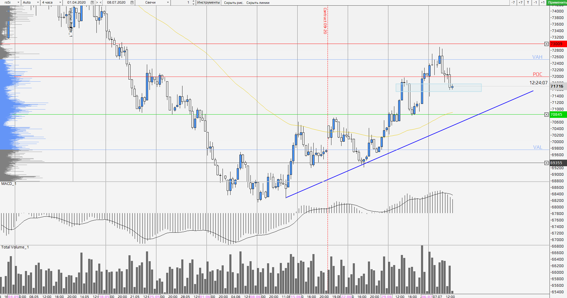 Доллар/рубль продемонстрировал разгрузку нисходящего тренда в первой половине Июня и перешел к росту. Мы ожидаем, что инструмент продолжит расти и вскоре достигнет отметки 73 рубля за доллар. Стоит отметить, что на фьючерсе USD/RUB основная поддержка находится на отметке 70845. Также трейдерам стоит обратить внимание на линию тренда, пробой которой укажет на окончание роста.