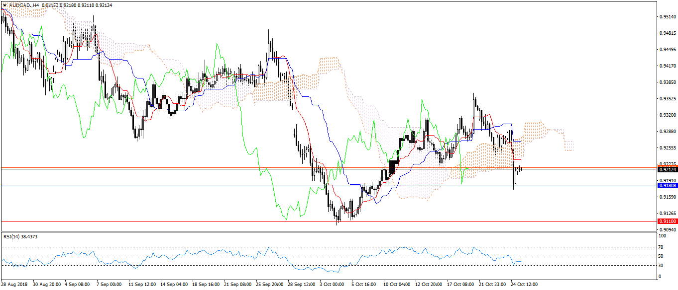 Технические индикаторы Ichimoku (цена наже облака, линия краткосрочного тренда Kijun и линия среднесрочного тренда Tenkan двигатся горизонтально) и RSI (находится ниже уровня 50). Рассматриваем продажи после пробития уровня 0.9180. Целью для снижения является минимум текущего года уровень 0.9110.