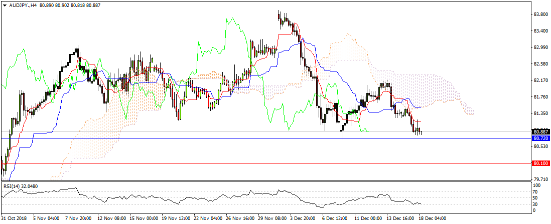 Технические индикаторы Ichimoku (цена ниже облака, линия краткосрочного тренда Tenkan и линия среднесрочного тренда Kijun двигаются горизонтально) и RSI (находится ниже уровня 50). Рассматриваем продажи после пробития уровня 80.720. Цель для снижения 80.100.