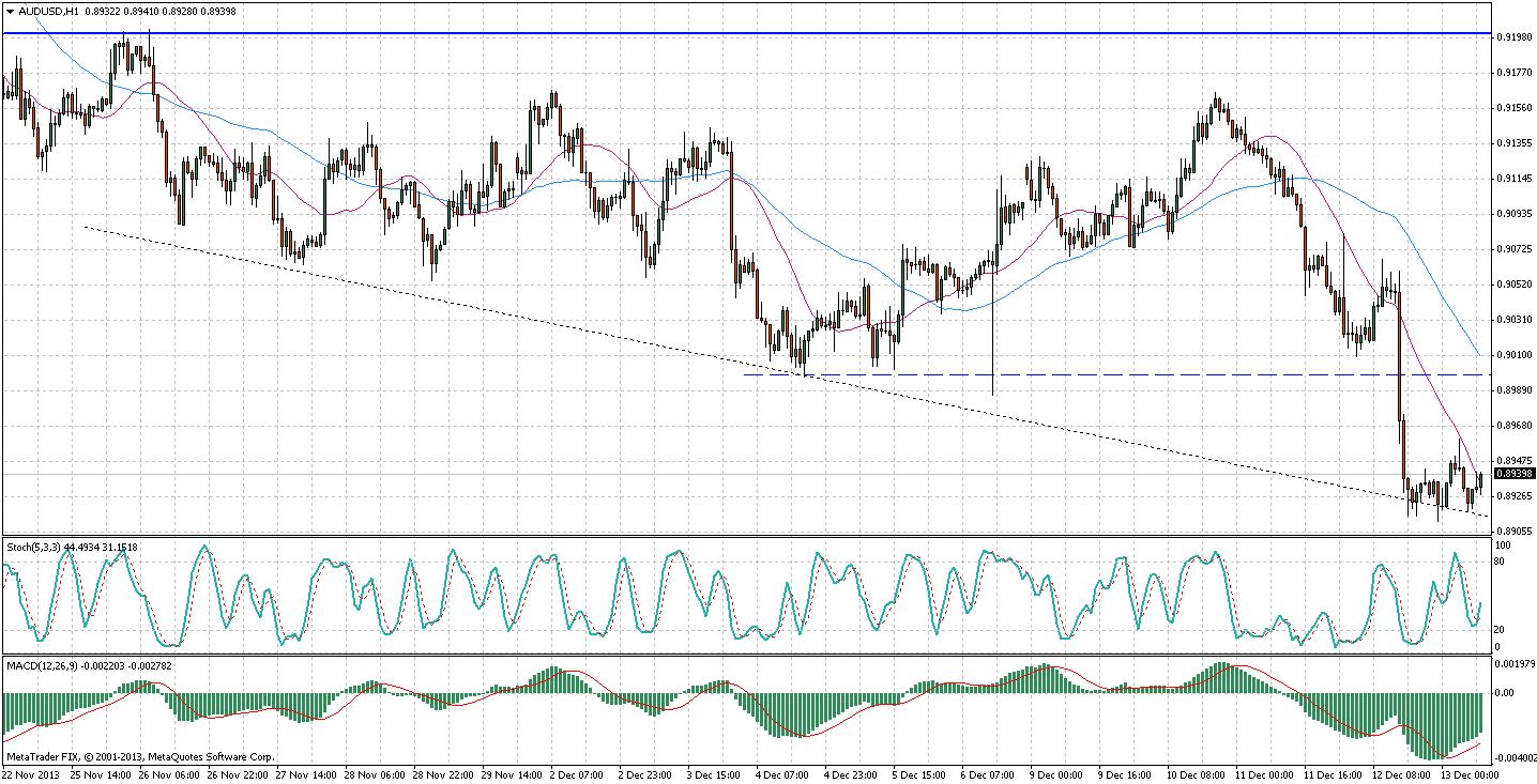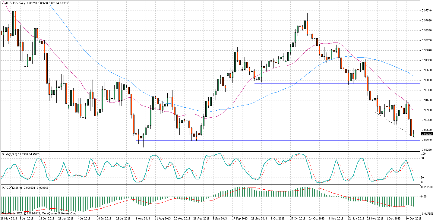 Вчерашний день отметился резким снижением австралийской валюты по всему рынку в связи с выступлением главы РБА Стивенса. Председатель РБА заявил, что курс национальной валюты все еще завышен, и что для экономики страны было бы лучше, если бы пара AUD/USD снизилась к 0,8500. Вследствие вербальной интервенции цена снизилась на 120 пунктов, вплотную подойдя до линии поддержки (проведена по минимумам 27.11 и 4.12.13), и приблизилась к уровню 0,8900. Индикатор MACD при этом пересек сигнальную линию и вновь указывает на падение.