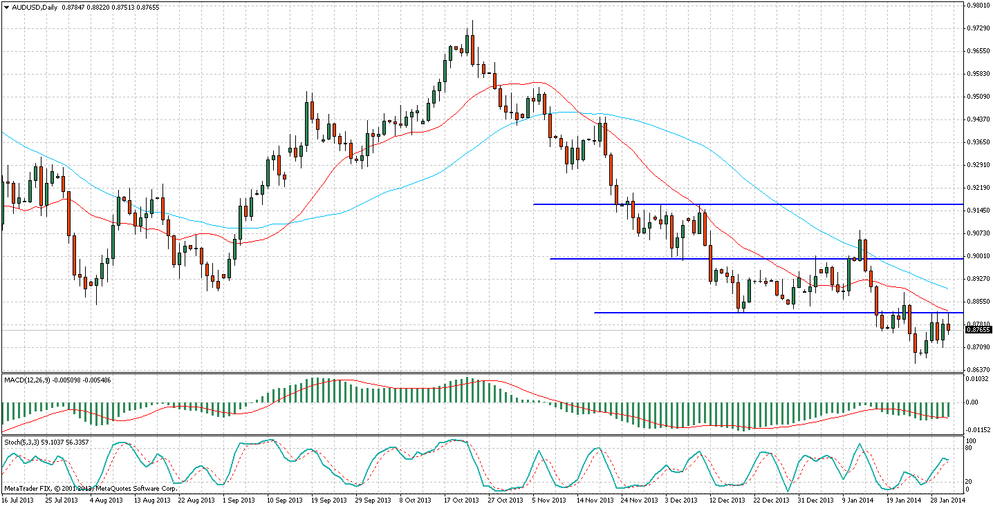 На фоне сокращения программы QE со стороны ФРС США идет волна укрепления доллара. Это в совокупности со стимулирующей политикой РБА способствует дальнейшему снижению пары AUD/USD. Валютная пара уже длительное время не может пробить сопротивление 0,8820. Оба мувинга синхронно идут вниз, их показания совпадают с данными MACD.