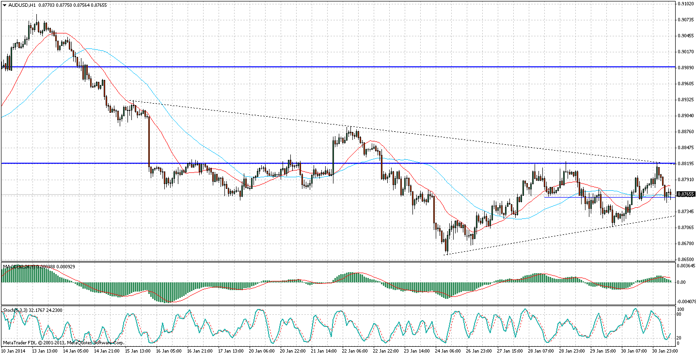 На часовом графике четкой динамики не прослеживается. В данный момент цена расположилась вблизи локальной поддержки 0,8760. Стохастический осциллятор при этом находится возле отметки 20, а гистограмма MACD по-инерции продолжает идти в нисходящем направлении.