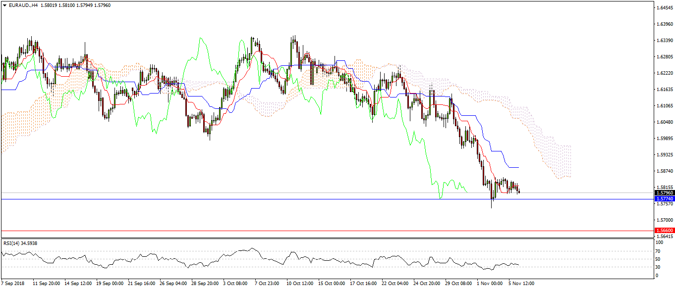 Технические индикаторы Ichimoku (цена ниже облака, линия краткосрочного тренда Kijun и линия среднесрочного тренда Tenkan двигаются горизонтально и не дают точных сигналов для продаж) и RSI (находится ниже уровня 50). Рассматриваем продажи после пробития уровня 1.5774. Целью для снижения является уровень 1.5660.