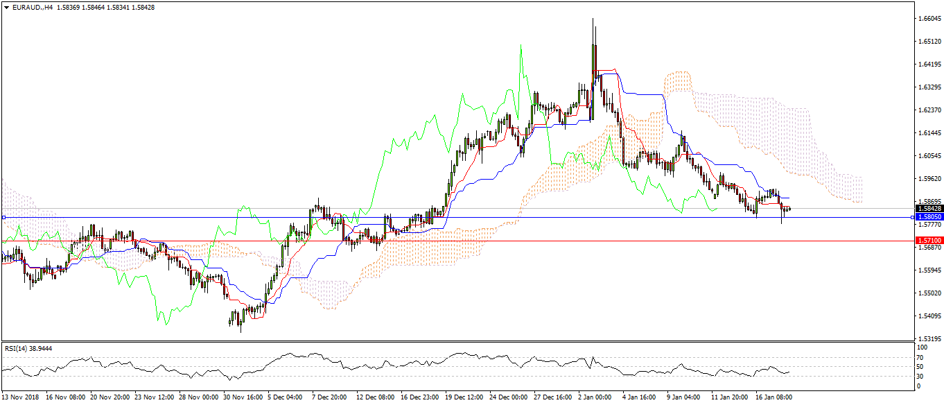 Технические индикаторы Ichimoku (цена ниже облака, линия краткосрочного тренда Tenkan и линия среднесрочного тренда Kijun двигаются горизонтально) и RSI (ниже уровня 50). Рассматриваем продажи после пробития уровня 1.5805. Цель для снижения 1.5710.