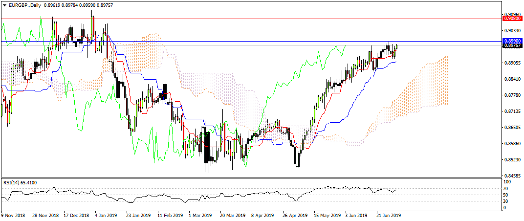Технические индикаторы Ichimoku (цена выше облаке, линия краткосрочного тренда Tenkan и линия среднесрочного тренда Kijun направлены вверх) и RSI (выше уровня 50). Рассматриваем покупки после пробития предыдущего максимума 0.8990. Цель для роста 0.9080.