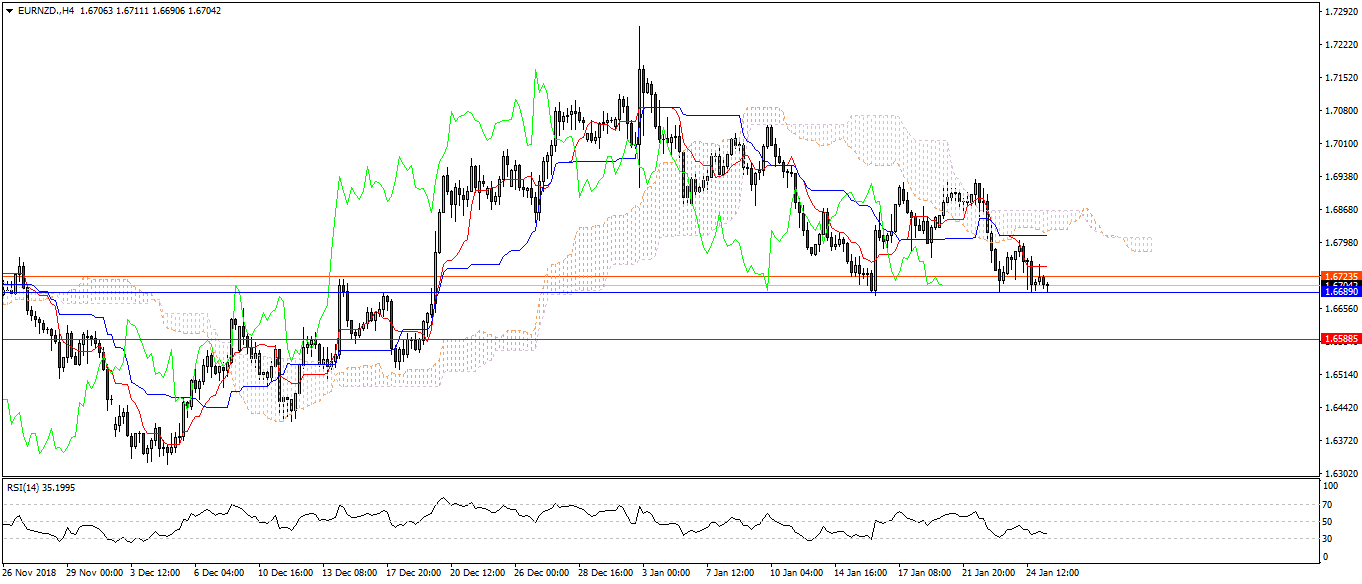 Технические индикаторы Ichimoku (цена ниже облака, линия краткосрочного тренда Tenkan и линия среднесрочного тренда Kijun двигаются горизонтально) и RSI (ниже уровня 50). Рассматриваем продажи после пробития предыдущего минимума 1.6689. Цель для снижения 1.6588.