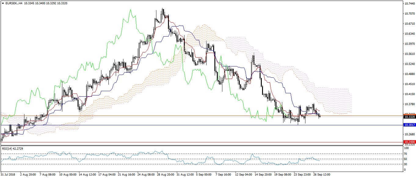 С начала сентября шведская крона укрепилась против евро на 400 пунктов. Технические индикаторы Ichimoku (цена ниже облака, ожидаем пересечение линией краткосрочного тренда Tenkan линию среднесрочного тренда Kijun сверху внизу) и RSI (находится ниже 50) сейчас не дают точных сигналов. Рассматриваем продажи после пробития уровня 10.3017. Цель для дальнейшего снижения уровень 10.2400.