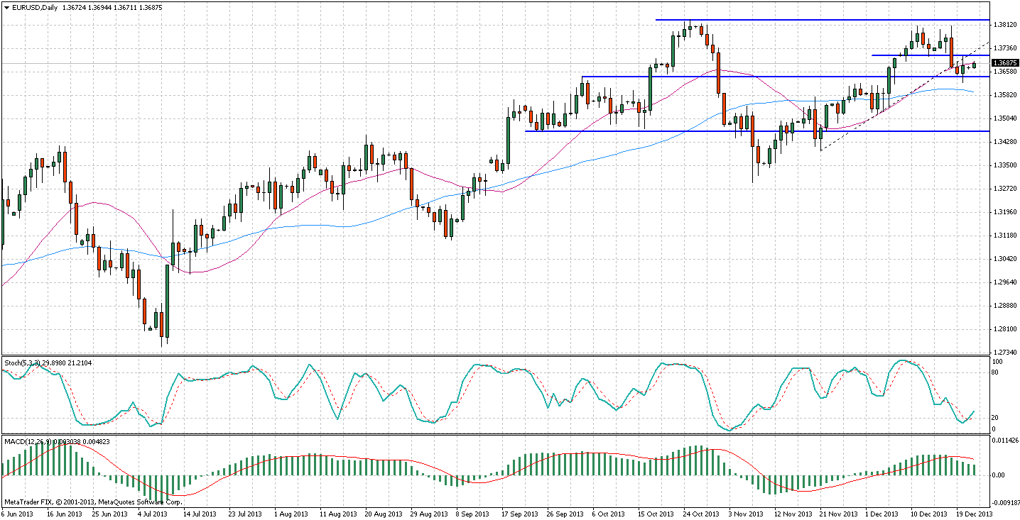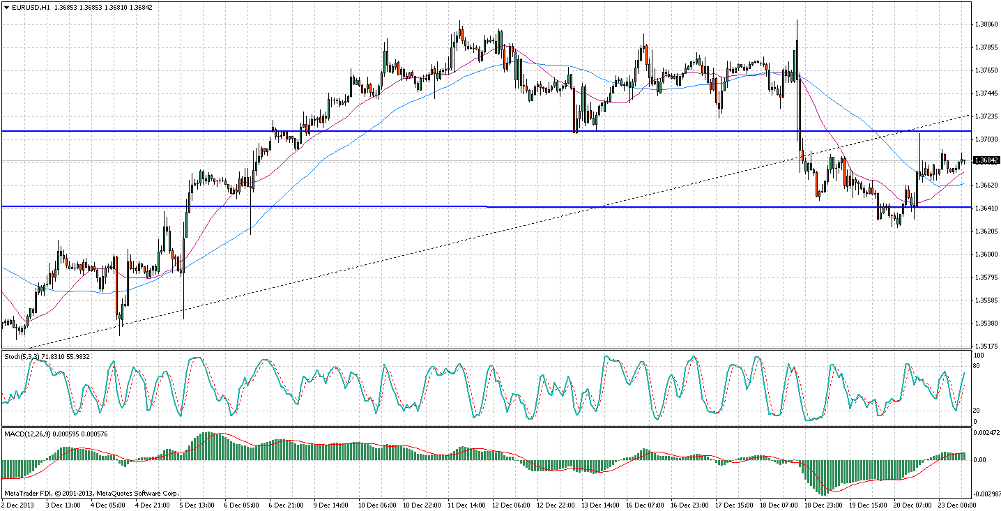 В прошлую пятницу выходил отчет по ВВП США. Показатель за третий квартал был пересмотрен с повышением с 3,6% до 4,1%. Данная новость резко оживила фондовые рынки, что в свою очередь привело к ослаблению американского доллара. Рост пары EUR/USD был остановлен на отметке 1,3708. Линии стохастического осциллятора после пересечения вышли из зоны перепроданности, индикатор MACD продолжает снижение.
