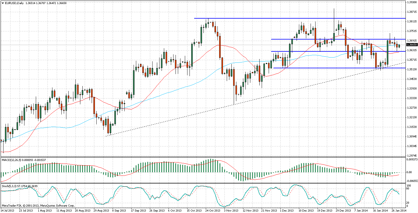 Основная валютная пара попала под давление на фоне ожидания того, что ФРС США продолжит процесс сокращения программы стимулирования QE3. Покупатели единой валюты не смогли закрепиться выше 1,3700 и последовала нисходящая техническая коррекция. Математические индикаторы, тем не менее, указывают, скорее, в сторону роста, чем падения (скользящие средние идут в восходящем направлении, MACD практически вышел в положительную зону).
