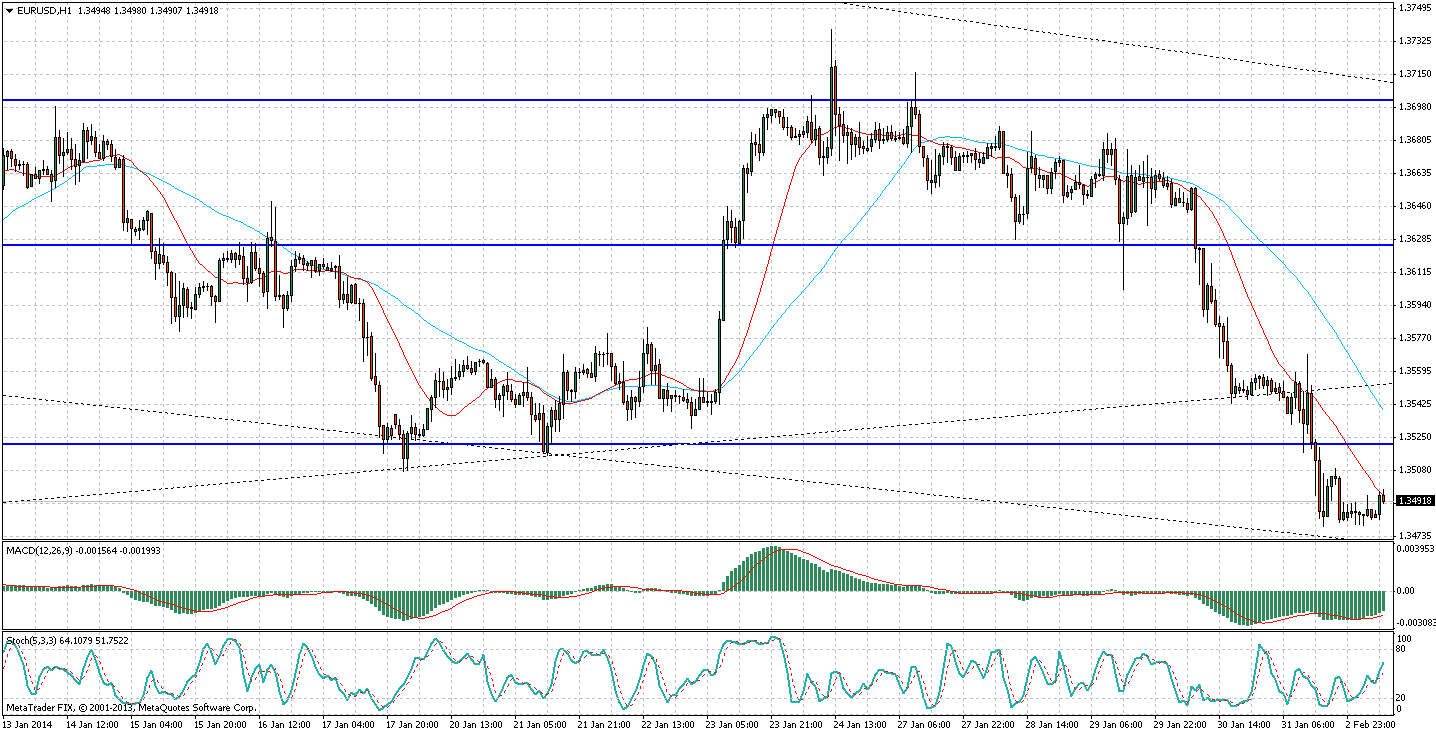 В пятницу американский доллар продолжил укрепляться относительно конкурирующих валют. Пара EUR/USD при этом пробила трендовую линию и уровень 1,3500. Стохастик опустился ниже отметки 5, а MACD-гистограмма возобновила снижение. Несмотря на пробитие важных уровней, констатировать разворот пока преждевременно, нужно подождать повторного теста линии тренда с другой стороны.