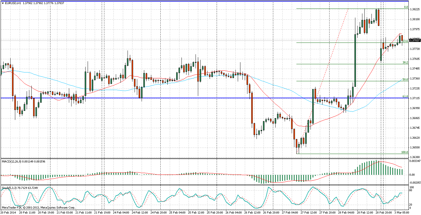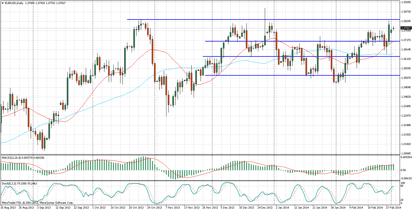 В пятницу основная пара резко выросла после публикации индекса потребительских цен в еврозоне за февраль. На этом фоне EUR/USD достиг максимума 1,3823, но закрылся на уровне 1,3802. Новая торговая неделя открылась с гепом вниз на 40 пунктов, что может быть обусловлено конфликтом между Украиной и Россией. Скользящие средние и MACD-гистограмма указывают на растущий тренд.