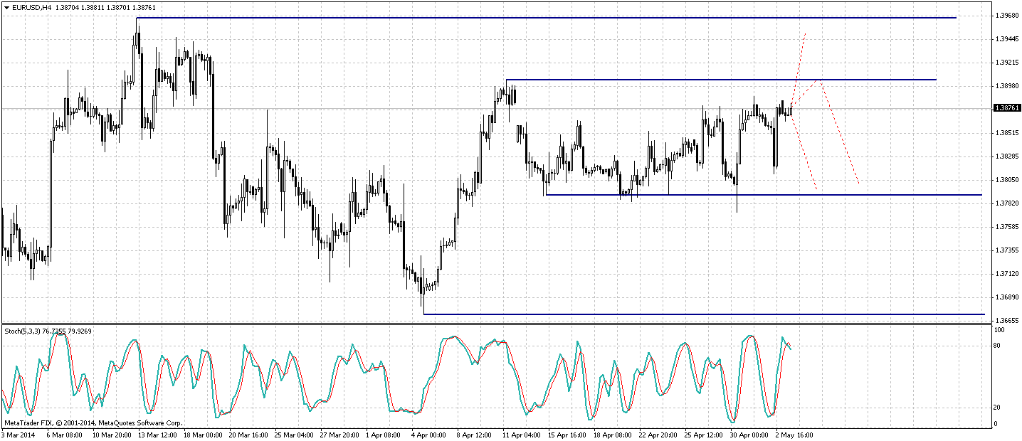 1. Покупку пары следует осуществлять выше уровня 1,3900 с постановкой стоп-лосса ниже 1,3860 (минимум азиатской сессии 05.05.2014);