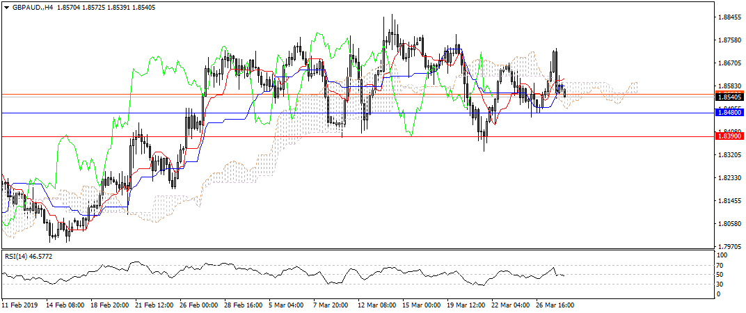 Технические индикаторы Ichimoku (цена ниже облака, линия краткосрочного тренда Tenkan и линия среднесрочного тренда Kijun двигаются горизонтально) и RSI (ниже уровня 50). Рассматриваем продажи после выхода цены с облака и пробития 1.8480. Цель для снижения 1.8390.