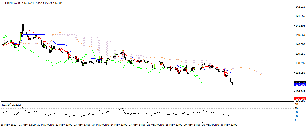 Технические индикаторы Ichimoku (цена ниже облаке, линия краткосрочного тренда Tenkan и линия среднесрочного тренда Kijun направлены вниз) и RSI (ниже уровня 50). Рассматриваем продажи после пробития 137.20. Цель для снижения 136.20.