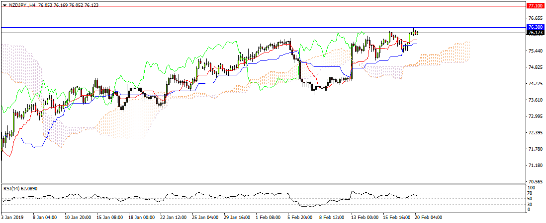 Технические индикаторы Ichimoku (цена вышла с облака, линия краткосрочного тренда Tenkan и линия среднесрочного тренда Kijun двигаются горизонтально) и RSI (находится выше уровня 50). Рассматриваем покупки после пробития уровня 76.300. Цель для роста 77.100.