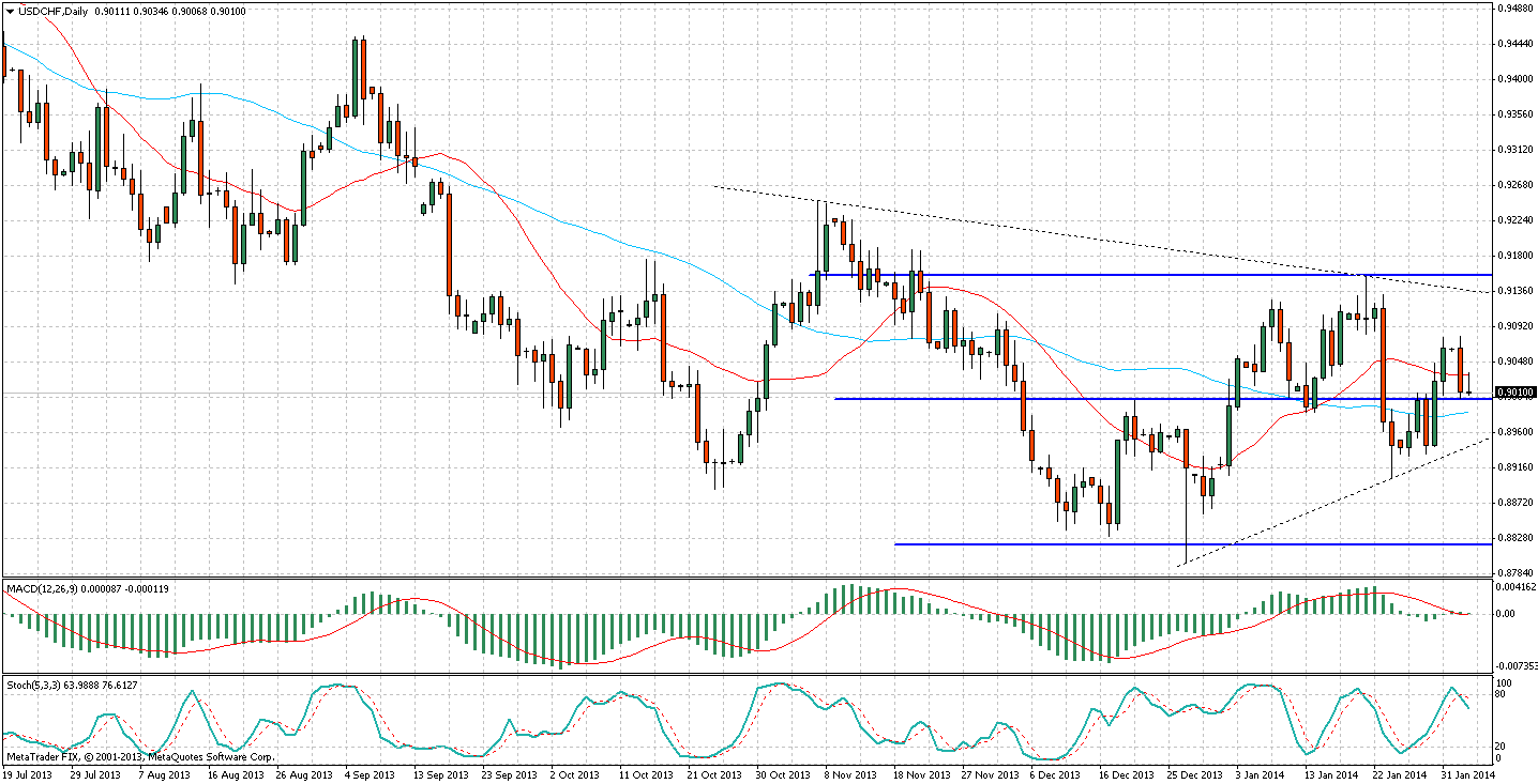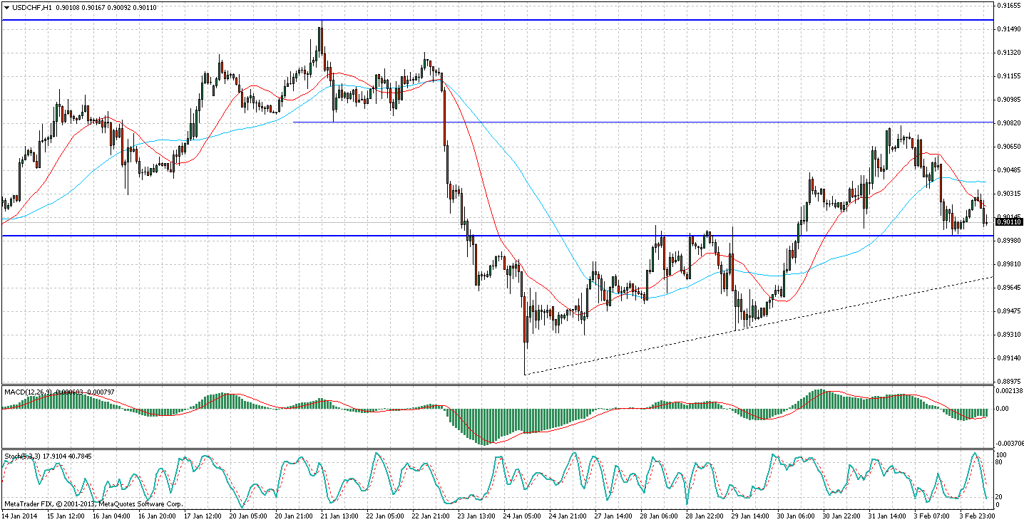 Вчера курс американского доллара скорректировался вниз относительно Швейцарской валюты по сравнению с пятничным ростом. Ослаблению доллара способствовали слабые данные по деловой активности в США. Цена достигла ключевой области поддержки 0,9000-0,8990. На дневном таймфрейме выраженного трендового движения не наблюдается, при этом на ценовом графике сформировалась треугольная формация больших размеров.