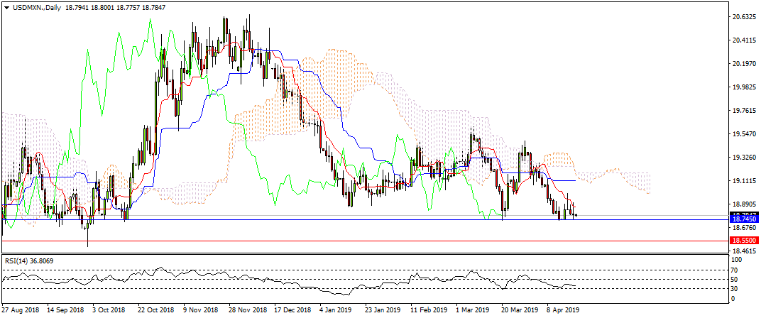 Технические индикаторы Ichimoku (цена ниже облака, линия краткосрочного тренда Tenkan направлена вниз, а линия среднесрочного тренда Kijun двигается горизонтально) и RSI (ниже уровня 50). Рассматриваем продажи после пробития предыдущего минимума 18.745. Цель для снижения 18.550.