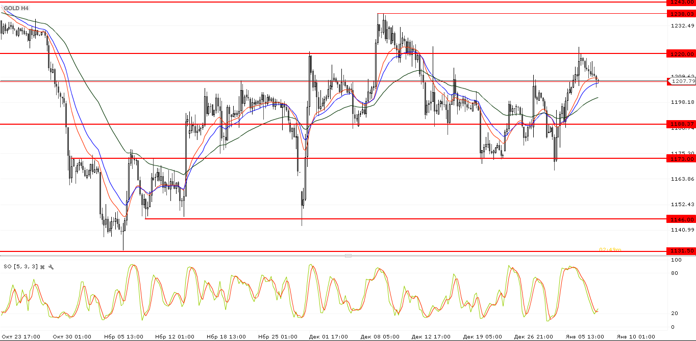 Быстрый Stochastic пересек медленный, что говорит о скором начале восходящего движения, хотя этот сигнал в данный момент не является сильным и определяющим дальнейшее направление тренда т.к. пересечение произошло выше зоны перепроданости. В данном ключе вполне вероятно возобновление восходящего движения с попытками закрепления выше уровня 1220,00. Дальнейшим значимым сопротивлением по золоту выступит уровень 1243,00.