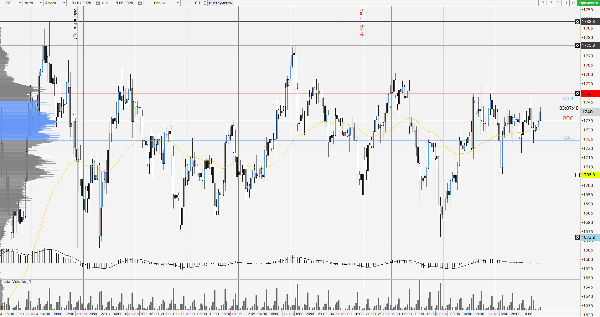 Золото торгуется в боковике уже довольно длительный период. Стоит отметить, что данный боковик имеет широкие границы и позволяет работать внутри на отскок от границ. Стоит отметить ключевые уровни. К примеру, сопротивление находится на отметках 1750 и 1775, при этом поддержка расположена на отметках 1705 и 1672.