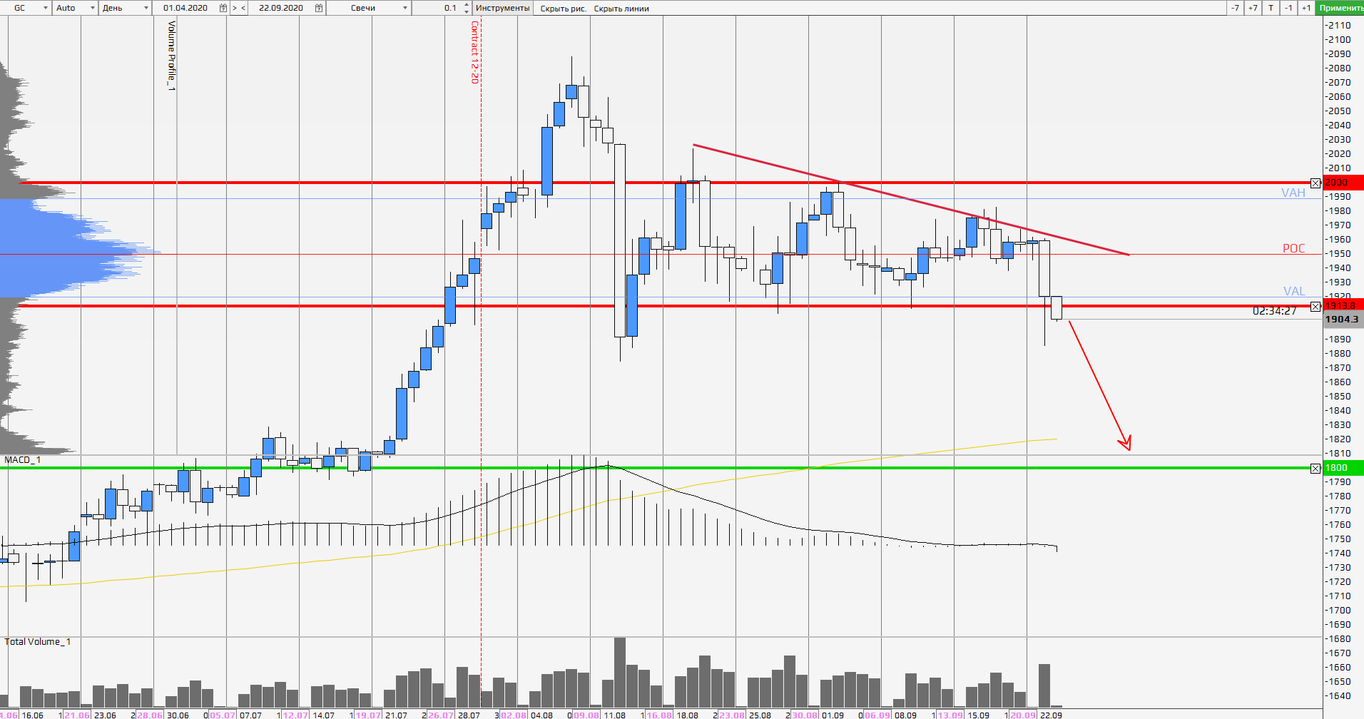 Золото весьма длительный период торговалось в треугольнике, поджимаясь к нижней границе. Вчера произошел импульсный пробой данного треугольника и теперь можно ожидать дальнейшее падение актива. Вероятно, мы увидим тест предыдущей зоны скопления обьемов в районе отметки 1800.
