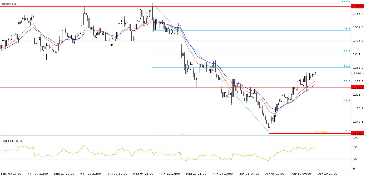 Фьючерс на индекс РТС продолжает свое восходящее движение, ближайшей целью которого станет сопротивление на уровне 1255,0 (50% FIBO нисходящего движения от 10.07.2014 года). При дальнейшем развитии восходящего тренда и закреплении выше данного уровня фьючерсный контракт сможет восстановиться к уровню 1280,0 (нижняя граница бокового канал от 16.06.2014 года).