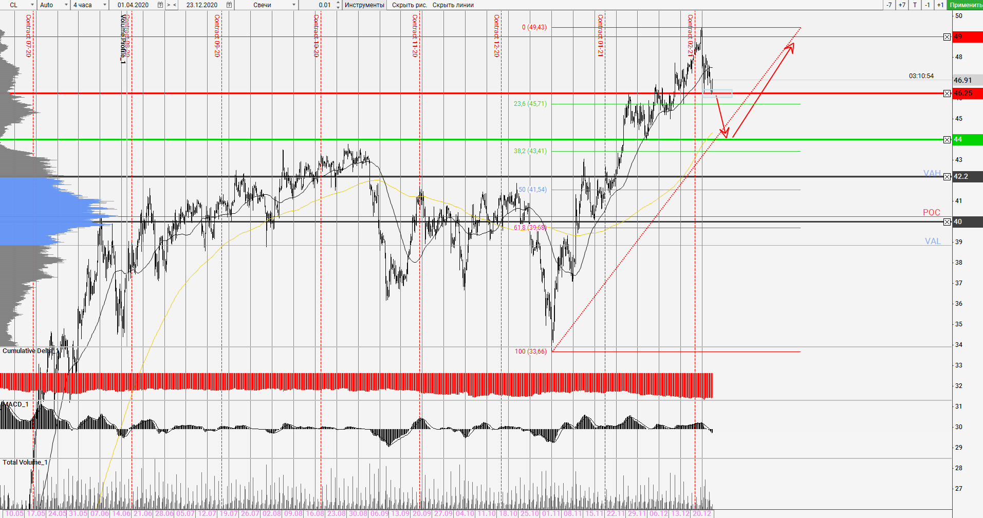 Сильный рост нефтяных котировок с начала Ноября подходит к концу. Напомним, что ралли составило $15 – цены восстановились с отметки $34 до $49. На данный момент уже началась коррекция к восходящему тренду. Цели коррекции находятся на отметке 44.00, что является локальной поддержкой и отметке 40.00, что является основной зоной концентрации обьемов торгов.