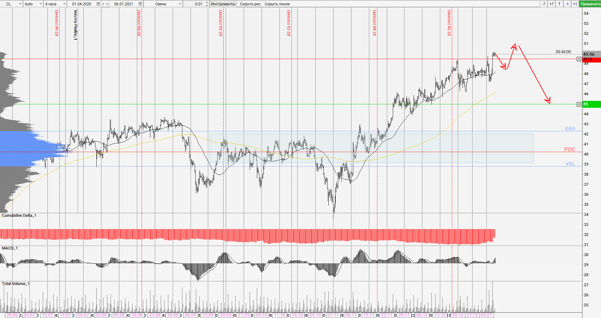 Вчера нефть поднялась на 11 месячный максимум после добровольного снижения добычи Саудовской Аравией. По данным скользящих средний, восходящий тренд продолжается и рынок нацелен на тест отметки $52. Вероятно, после достижения этой отметки мы увидим дивергенцию и коррекцию цены к уровню поддержки 45.00.