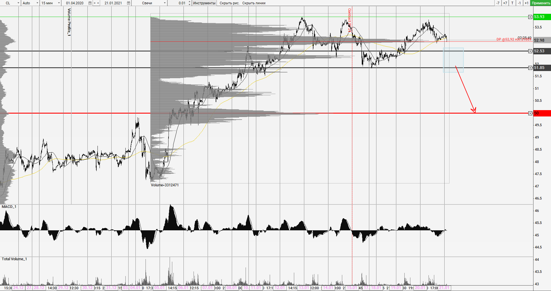 Нефть продолжает консолидироваться в районе отметки $53. Стоит отметить, что данный боковик имеет все признаки разгрузки, что обычно сопровождается коррекцией. Рекомендуем обратить внимание на объемный уровень 52,53 – 51,85 и торговать шорт на пробой данного уровня. Целевой отметкой коррекционного падения котировок мы выделяем отметку $50.